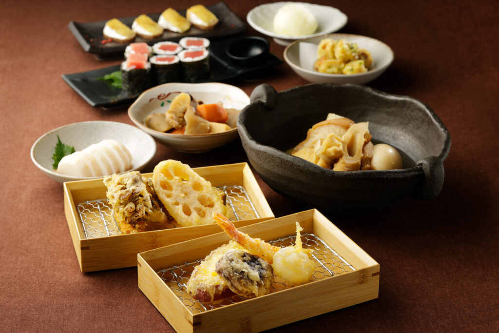 旬の野菜や海鮮を、素材に合わせて軽やかに揚げる天ぷら。定番から季節の味覚まで、揚げたてならではの食感と香りを大切にしています。天ぷらに加え、心和むおばんざい、本マグロのお刺身、牛すじや大根の白味噌おでんなど、和の一品も揃えました。